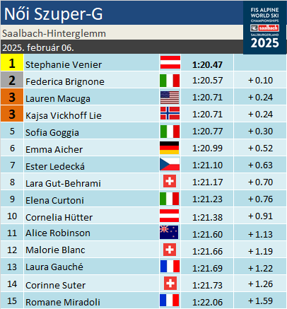 Federica Brignone megszerezte negyedik világbajnoki érmét, a harmadik ezüstjét, így változatlanul képtelen speciálszakágban felérni a csúcsra, már ami a világversenyeket illeti. Ma is apróságokon ment el az esély, ám minthogy Fede’ remek formának örvend, aranyossá változhat még a saalbachi meséje. Kajsa Vickhoff Lie két év után ismételten a dobogó alsó fokára állhatott fel, mégpedig megint csak holtversenyben. Akkor három századon múlt az érme, és Hütter volt a társa a 3. helyen, ma Lauren Macuga, s 6 századon. 2018 kétszeres junior-világbajnoka most már nagyon kapirgálja a csúcsokat, aligha fog sokat váratni magára az első arany. A 22 esztendős amerikai tehetségről pedig lehetett tudni, hogy fényes jövő előtt áll. Három éve még tinédzserként szerzett bronzérmet a juniorok közt, a következő télen megnyerte az Észak-Amerikai Kupa lesikló pontversenyét, majd azt követően pontszerzésben gazdag debütáló idényt teljesített a Világkupában. A mostani szezonja Sankt Anton-i győzelmét kivéve is remekül sikerült.