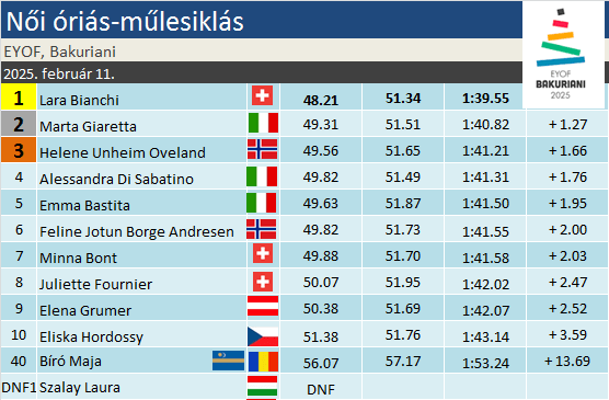 A fiúk versenyével ellentétben női óriás-műlesiklásától az ifjúsági ranglista legjobbjai távol maradtak. A TOP10-ből csupán egy norvég lány utazott el Georgiába. Nézzük persze a jó oldalát: így megadták az esély papíron esélytelenebb sporttársaiknak az éremszerzésre. Összesen 75 tinédzser csatolt sílécet ma reggel, köztük Szalay Laura és a székelyföldi Bíró Maja.