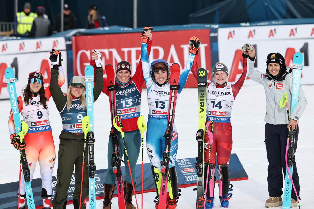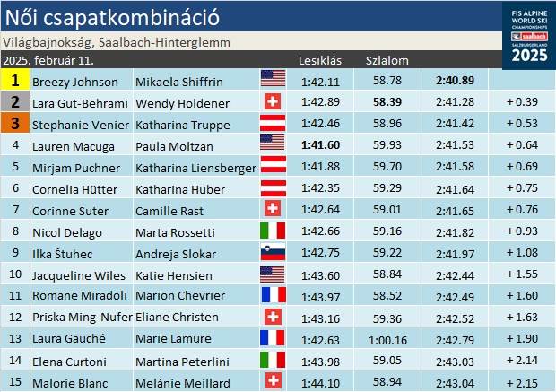 Amerikai győzelemmel debütált a női csapat kombináció az Alpesi Sí Világbajnokság programjában. A lesiklás világbajnoka, Breezy Johnson ugyan csak a negyedik lett saját terepén, Mikaela Shiffrin azonban korrekt második futammal az első helyig repítette a párost. Ehhez viszont kellett a lesiklás után dobogós hármas gyengélkedése is: a feltávnál vezető Lauren Macuga párja, Paula Moltzan a dobogóról is lecsúszott, ahogy hibázott Aicher párja Dürr, és a Puchner-Liensberger páros utóbbi tagja is. A dobogóra, a legjobb szlalommal a lesiklás után még másodperces hátránnyal álló Lara Gut-Behrami és Wendy Holdener törtek fel, míg a házigazdáknak Stephanie Venier és Katharina Truppe szereztek bronzérmet!