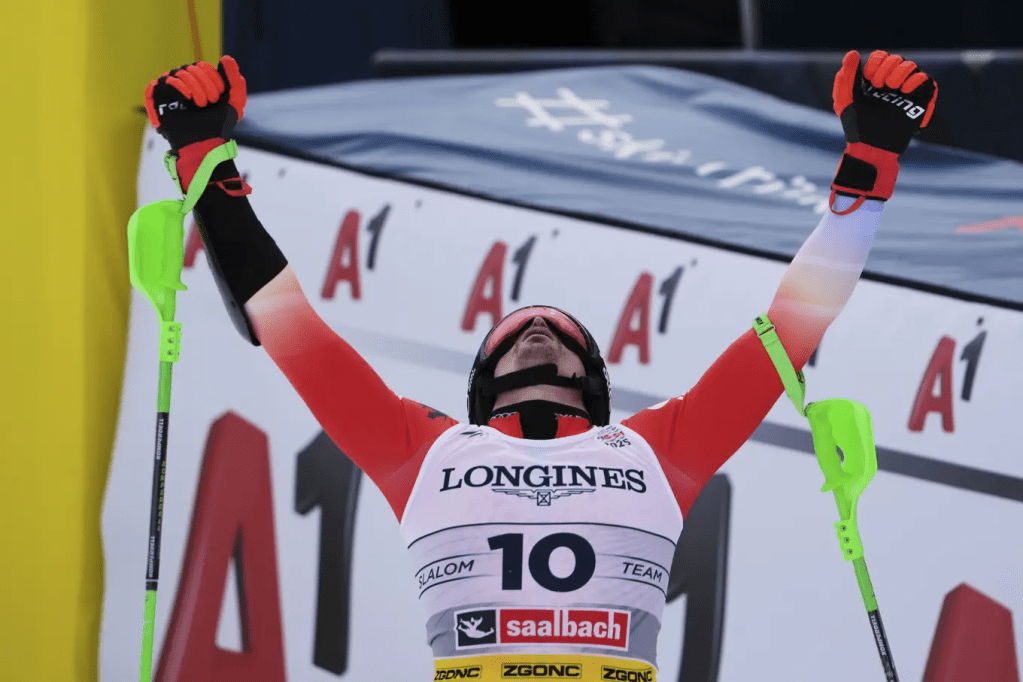 Az aktuális harmadik hely mára nem ígért érmet a hazaiaknak. Alex Vinatzert nyilvánvalóan győzelembe hajszolta edzője, „rock & roll” üzemmódot kért tőle. Fent ritmustöréssel kezdte a meredeket, ezzel együtt egálnál állt a táv nagyjából felénél. Mindhiába, egy sűrű kombinációban túlgyorsult, lemaradt az egyik stangliról. Loïc Meillard (1.) másodperc fölötti előnyből gazdálkodhatott. A biztos svájci érem tudatában sokat vállalt, ami különösen a meredek legvégén bizonytalanságokat szült. A lendület kitartott a Zielhangon, a végső differencia pedig bő 4 tizedre rúgott. Innentől a svájci tarolás volt csak kérdés tárgya. Tanguy Nef (2.) sem adta alább, mert támadni. Fent elolvadt minimális előnyét a meredek tetején visszahozta, a céllejtőre egál közeli helyzetből fordult. Ott azonban Meillard nagyon begyorsult, ami ellen nem volt ellenszer. A fieszta persze ettől függetlenül elkezdődött: hármas svájci dobogó Saalbachban!