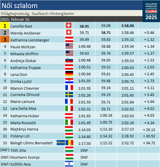 Wendy Holdener kilencedik világbajnoki érmét teheti a virtinjébe, ebből nyolcadszorra lett a medália színe ezüst. Újabb nagy esély, újabb elhalasztott esély. Ettől még ez így is korszakos eredménysor. A pekingi olimpia szezonja óta csak kereste önmagát, idén már voltak arra vonatkozó jelek, hogy megtalálta a fonalat Katharina Liensberger. Kétszer állt dobogón, volt két negyedik helye. 2021 világbajnokának ez a mai bronz nagy lökést adhat a folytatásra.
