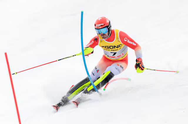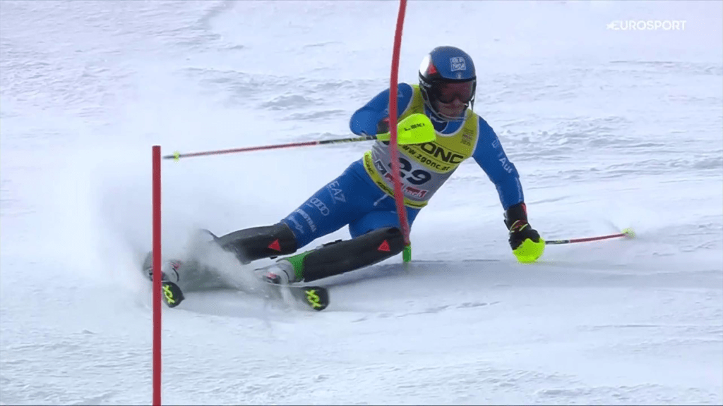 Steven Amiez (7.) túl sok kockázatot vállalt, ami sok kis apró rontással, ezáltal sebességvesztéssel járt együtt. Kristoffersent előzte csak meg. Albert Popov (18.) a kiesés széléről megmenekült ugyan, de a lendületveszteség ezen a lejtő hatványozottan jelentkezik – senkit nem előzött meg. Dave Ryding (13.) kiválóan kezdett, középtájon is úgy-ahogy tartotta a legjobbakat, aztán a második letöréstől kezdve fokozatosan esett szét mozgása. Méterekkel stangli alatt fordult, a záró szektorban egy komplett másodpercet szedett össze. Kristoffer Jakobsen briliánsan szlalomozott a csapatkombináció keretében, már önmagában amiatt fellépett az esélyesek közé. Ma nem húzta sokáig: igyekezett szűken fordulni, korai kapura lépés lett a vége. Hisztérikus dühkitörésben (#skiverrückt) tört ki a svéd, botjai bánták a rohamát. A betegeskedő Lucas Pinheiro Braathen (10.) konszolidáltan haladt, nem vállalt elegendő kockázatot, hozzá hasonlóan Daniel Yule (12.) kanyarulatai is tágabbra sikerültek a kívánatosnál. Fabio Gstrein (9.) veszélyt nem jelentett az élen állókra, nyugodt sízését nem kultiválta az időmérő műszer; Samuel Kolega (20.) lábai alatt a középszerűbb ritmus mellett is rendszeresen megremegtek lécei. Ment a lista végére.