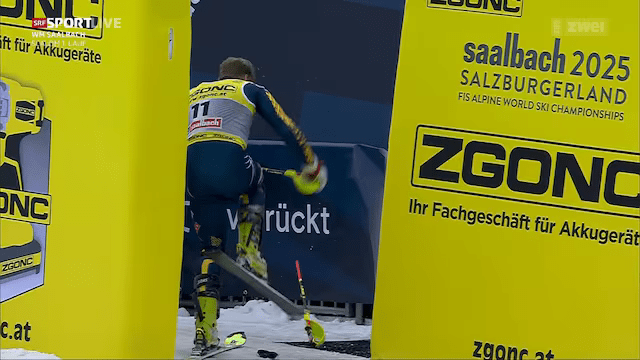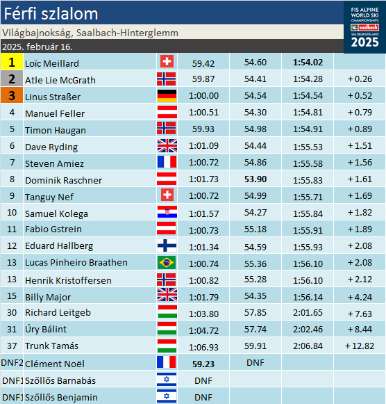 Straßer (3.) középtájon párszor távol került a kapuktól, sízése ugyanakkor folyamatosabb volt, mint Felleré. Jelentős alaptempóját végigvitte, így szűk 3 tizeddel átvette a vezetést. Haugan (5.) sízése inkább volt munkásabb, mint harmonikus, a céllejtő nyitányán ezzel együtt szinte egálra állt a némethez. A végtempó… na, az tovaszállt, ott Straßer lécei jobban mozogtak. A müncheni specialista érmét, egyben a németek első idei vb-érmét McGrath (2.) hiúsította meg. A céllejtő tetején történt nagy mentése után kevesen hitték volna, hogy az ifjú norvég topszektort rittyent zárásra, mégis így történt. Meillard (1.) elképesztően lendületes nyitány után középtájon tartotta előnyét. A céllejtőn egy McGrath környékén mozgó részidővel komoly nyomás alá helyezhette volna Noëlt, de azért így sem nézett ki rosszul a helyzet. A francia visszafogottan kezdett, nem igazán találta az utat. Az átkötő részen aztán jött a menetrend szerinti kapura lépés. Franciaország érem nélkül maradt, Svájc adja a szlalomos világbajnokot a férfiaknál is!