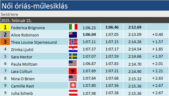 Federica Brignone a Saalbachban aratott világbajnoki címet követően 15. sikerét aratta óriásban, amivel minden idők 5. legsikeresebb női óriásműlesiklója. Immár csak Shiffrin, Schneider, Moser-Pröll és Worley előzi – utóbbi kettő mindössze egy sikerrel. Összesítésben pedig beérte Hanni Wenzelt és Bode Millert: mindhárman 33 győzelmet számlálnak a mai naptól. Brignone egyébként az idén 6. alkalommal győzött világkupán, amihez foghatót csak a tavalyi évben sikerült elérnie – a szezonból pedig még bőven van hátra… A 15-ös szám jellemzi ma Alice Robinsont is: a világbajnoki ezüstérmes ugyanis ennyiszer állt VK-dobogón karrierje során, mindannyiszor óriásban. Ennek harmada származik ebből a szezonból, ami esetében is a tavalyi szezonban elért karriercsúcs beállítását jelenti. Thea Louise Stjernesund azok után, hogy egy hete mindössze 1 századdal lemaradt a világbajnoki bronzéremről, most VK-dobogóval vigasztalódhatott. Karrierje során ez volt a 4. ilyen alkalom. Legutóbb a tavalyi VK-döntőn, Saalbachban végzett ilyen előkelő pozícióban.