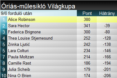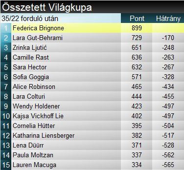 A szakági világkupában Robinson minimálisan tovább tudta növelni előnyét a ma sem a legjobbját nyújtó Hectorral szemben. Brignone azonban a kronplatzi nullázást követően megkezdte a felzárkózást, bár előnye továbbra is jelentős, 80 pont. Összetettben viszont egyre tisztábba kép: Gut-Behrami mai nullázásával bőven 100 pont fölé növelte előnyét Brignone. A harmadik helyen is megy az adok-kapok, most épp Ljutić ugrott fel a dobogó aljára, Rastot előzve. Azonban ez a meccs még sokesélyes, Hector, Goggia és Robinson is lőtávolon belül.