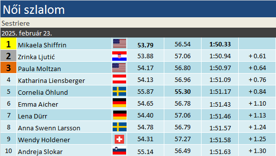 Zrinka Ljutić (2.) ugyan minimális előnye jó részét hamar eladta, a meredekebb hullámon jobban jött, mint az amerikai. A végére így is hátrányból fordult, de jobb sebességének köszönhetően át tudta venni a vezetést. Mikaela Shiffrin (1.) remekül síelt, rezzenéstelen íveket húzott, és kalsszis menettel rukkolt elő. Kisebb hiba sem jött tőle, folyamatosan nőtt előnye. Nem volt kérdés, megvan a 100. győzelem!