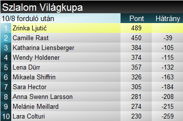 Szlalomban, részben Rast mai nullázásának köszönhetően visszavetette a szakági vezetést Ljutić. Előnye mindössze 39 pont két versennyel a szezon vége előtt. Így ha a világbajnok mindkét hátralévő versenyt megnyeri, akkor Ljutić eredményeitől függetlenül is megnyerheti még a kis kristálygömböt. Liensberger, Holdener és Dürr már 100 pont feletti hátránnyal rendelkezik.