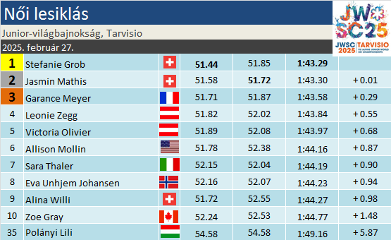 Főként úgy, hogy a legjobb három futam csak ezután következett. Garance Meyert (3.) egy éve – szűkebb pátriája előtt – agyonnyomta a teher, ma már felszabadultabban tette a dolgát. Senki nem robbant neki úgy a pályának, mint a francia, aztán bár voltak megakadásai, térvesztései, egyetlen századdal élre tudott állni. Mint az várható volt, a norvégok nem remekeltek a szokottnál puhább havon. Az alapjáraton az esélyesek közt számon tartott Eva Unhjem Johansen (9.) csak a végére talált rá lendületére, a közel 5 tizedes differencia azért soknak volt mondható. Stefanie Grob (1.) aztán alaposan beleerősített, mert bár fent elmaradt némiképp a franciától, különösen a záró részen simán verte őt. A 27 százados időkülönbség már a szemmel észrevehető kategóriába került. A rendkívül enervált és zaklatott Ludovica Righi (17.) után a mezőny „potyautasa”, vagyis Jasmin Mathis (2.) majdnem megtréfálta honfitársát. A középső szakaszon senki nem ment nála jobbat, fent is erősebb volt egy kevéssel, egyedül a végét kárhoztatja, ott már volt néhány kanyarkiszélesítése. Végül 14 százados hátrányból várta a folytatást. A „potyautas” jelző onnan van, hogy Janine Mächler hátfájdalmak miatti visszalépése adta meg neki az esélyt, eredendően ki sem utazott volna Tarvisióba. Ehhez képest szó szerint majdnem junior-világbajnok lett. Na, de erről még egy kicsit később…
