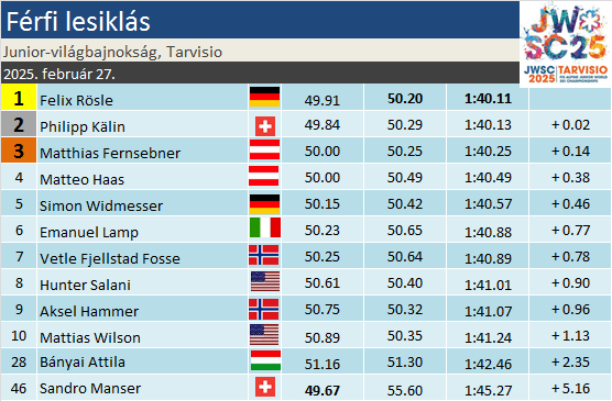 Felix Rösle – tenisznyelven szólva – a verseny ötödik kiemeltje volt, innen nézve sikere nem volt nagy meglepetés. Az előző junior-vb-n a királyszámban kilencedikként zárt síző egy fergeteges dél-amerikai túra után az Európa Kupában került rendszeresen az erős pontszerzők listájára. Nem mellékesen közel került a TOP100-hoz, a juniorkorszakában domináns Luis Vogt méltó örökösének számít. Philipp Kälin február derekán, Crans-Montanán állt dobogóra az Európa Kupában, ezeken kívül is számos erős pontszerzése volt. Látni fogjuk még a Világkupában. Az osztrákok közül nem annyira Matthias Fernsebner volt várható a pódiumra, sokkal inkább Haas. Alkalmi EK- pontszerzőnek számít egyelőre, az viszont megelőlegezte a bizalmat, hogy a ranglistán nagyokat lépett előre idén.