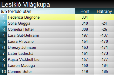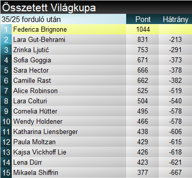 A szakági világkupában szorosabbá vált az állás. Brignone ugyan továbbra is vezet, de előnye már csak pont Goggia előtt, és a címvédő Hütter is 26 pontra zárkózott fel. Összetettben viszont épp ellentétesen alakult Fede’ napja: Gut-Behramival szemben tovább nyílt a már meglévő olló és immár 200 pont feletti előnnyel vezet 2020 összetett győztes a címvédővel szemben. Időközben Goggia megkezdte a felzárkózást, de a hétvégét kihagyó Ljutićcsal szemben így is dobogókra lesz szüksége, hogy feljöjjön a dobogóra.