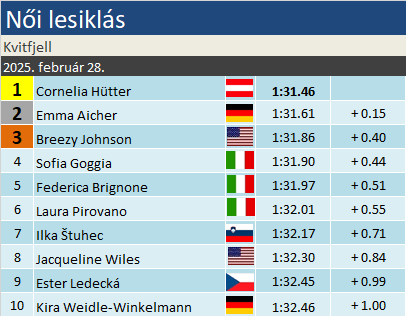 Cornelia Hütter nyerte a kvitfjellben rendezett pénteki lesiklást. Az osztrák a pálya teljes egészében remekül síelt, sokáig úgy tűnt jelentős előnnyel nyeri a versenyt. Egész későn érkezett viszont Emma Aicher és végül mindössze 15 századdal elmaradva megszerezte karrierje első dobogóját. A harmadik helyen a friss világbajnok Breezy Johnson végzett, 3 év után visszatérve világkupa-dobogóra. Bár a legjobb hatban 3 olasz is végzett, sorrendben Goggia, Brignone és Pirovano, dobogón nem végzett közülük senki. A szakágiban Brignonéra nagyot zárkóztak a közvetlen ellenfelek, összetettben azonban immár kényelmes előnye van Gut-Behramival szemben.