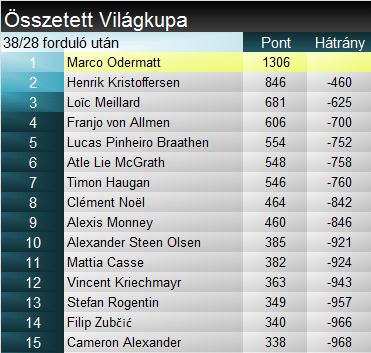 Összetettben közel sem ilyen kiélezett a harc. Tíz verseny van még hátra, és 1000 megszerezhető pont mellett Odermatt előnye 460 pont. Kristoffersen holnapi eredményének is függvénye, de nem kizárt, hogy a svájci már jövő vasárnap, Kvitfjellben matematikailag is bebiztosíthatja újabb összetett elsőségét.