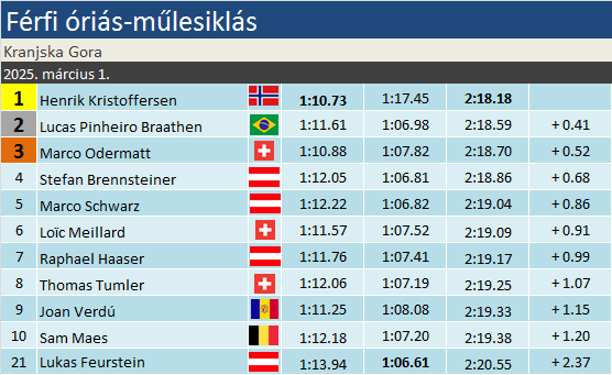 Henrik Kristoffersen ma igazán elemében volt. Az általa többször kárhoztatott haladós pályatűzés, vagy épp a tavaszias hóviszonyok sem tudtak rajta kifogni a második futamban, 3 év után nyert ismét óriás-műlesiklást. Ráadásul délelőtti közvetlen vetélytársa, egyben szakági ellenlábasa Marco Odermatt a második futamban visszacsúszott a harmadik helyre, így a szakági pontverseny váratlanul szoros végjátékot vetít előre. Remek második futammal Lucas Pinheiro Braathen öt helyet javítva meg sem állt a második helyig, míg az osztrákok remek csapatteljesítménnyel hárman is a dobogó mögötti négyesben végeztek.