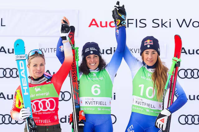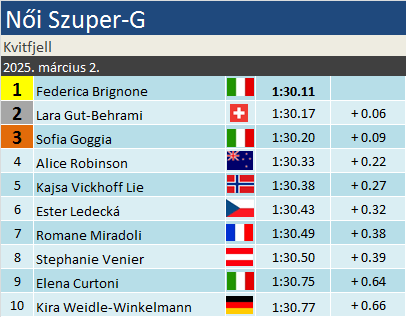 Lara Gut-Behrami egyre közelíti a 100. dobogót, a maival együtt ugyanis már 98-nál jár. Ennek közel fele, 44 született szuper-G-ben. Idén hetedik alkalommal dobogós. Sofia Goggia is jubilált ma, 60. alkalommal végzett a legjobb háromban, ebből tizenhetedjére szuperóriásban. Érdekesség, tavaly pontosan ugyanebben a sorrendben végzett ez a hármas a kvitfjelli szuper-G-n.