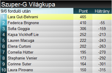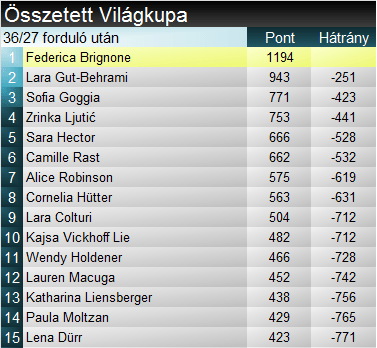 A szakági világkupában 3 versennyel a szezon vége előtt igen szoros a csata az első helyért. Azzal, hogy Gut-Behrami mindössze egyszer szorult ki a top3-ból, vezeti a pontversenyt, előnye azonban már csak 55 pont Brignene élőtt. Goggia már nem valószínű, hogy beleszól a kis kristálygömbért folyó harcba. Az összetett első három helyezettje megegyezik sorrendben a mai dobogósokkal, de az állás közel sem olyan szoros, mint volt a verseny. Brignone egyre kényelmesebb, immár 250 pontos előnnyel vezet Gut-Behrami előtt. Goggia a hétvége végére csak feljött a 3. helyre, de jövő hétvégén ismét technikai számok következnek, így Ljutićnak esélye nyílik visszaelőzni az olaszt.