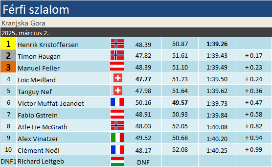 A norvég egyensúlyozott a legügyesebben a kádasodó céllejtőn, amivel egyrészt a 6. helyről fordulva megnyerte a szlalomot, másrészt a 10. helyre visszaesett Noëllel szemben tisztesnek mondható, 77 pontos előnyre tett szerint a szakági tabellán. Két versennyel az idény vége előtt. A Van Deer-lécmárka örvendhet, hiszen Timon Haugan (+0.17) végzett a második helyen. A dobogó harmadik fokáról egyetlen század döntött Feller (+0.23) javára, a világbajnok Meillard részéről így nem fértek bele a céllejtőn elkövetett durva rontások. Nef zárt az ötödik, a 20 helyet előreugrott Muffat-Jeandet pedig a hatodik helyen. Richard Leitgeb az első futam korai szakaszában kiesett.
