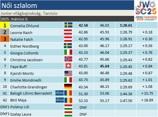 Cornelia Öhlund győzött szlalomban a junior-világbajnokságon. Ljutić és Colturi hiányában a svédek tehetsége számított a legnagyobb esélyesnek, de az aranyért alaposan meg kellett küzdenie. Az első futam után is vezetett, végső soron 18 századdal nyerte a versenyt. A dobogóra két osztrák lány, Leonie Raich és Natalie Falch állhatott még fel. Ester Nordberg révén még egy svéd zárt az elejében, az ötödik helyen Giorgia Collomb, míg hatodikként Christina Jakobsen fejezte be a napot. Magyar szempontból nem zártunk eredményes napot. Körtvélyessy Dóra betegség miatt kénytelen volt visszalépni, Polányi Lili és Szalay Laura pedig kiesett délelőtt. A székely lányok közül Balogh Lőrinc Bernadett a 41., Bíró Maja a 42. helyen zárt.