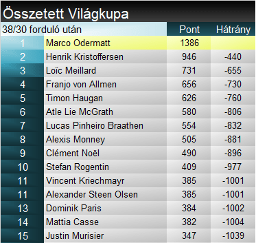 A szakági pontversenyben Odermatt 30 pont újabb előnyre tett szert, amivel előnye mindössze két versennyel a szezon vége előtt 103 pont fölé nőtt. Ezzel akár már holnap is bajnokavatás következhet. Reálisan mindez akkor következhet be, ha Odermatt ismét von Allmen előtt végez. Összetettben pedig már bőven 400 pont felett jár a háromszoros címvédő előnye. Amennyiben a hétvégén még két dobogót szerez Odermatt, 160 ponttal (1 győzelem + dobogó, vagy két második hely), akkor az összetett bajnokavatás is meglehet még itt, Kvitfjellben.