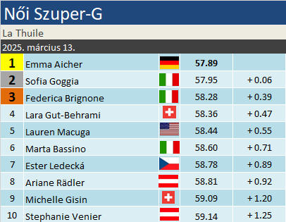Emma Aicher várt, mégis robbanásszerű megérkezése az élmezőnybe ma egy újabb szakágban is megvalósult. A német tehetség kihasználta az alacsony rajtszám nyújtotta előnyöket, s egy aránylag kompakt menettel megelőzte a szakág favoritjait. Sofia Goggia mindössze 6 századdal maradt el tőle, míg a dobogó harmadik fokára az összetett pontverseny éllovasa, Federica Brignone állhatott fel. Az olasz sztár ezzel ismételten megelőzte Lara Gut-Behramit, akinek a szakági pontversenyben 45 pontos előnye van két futammal a vége előtt. A tavaszias hóviszonyok és az idővel elbújó nap mellett több kiesés okozott felfordulást, továbbá egy pályamunkás újraélesztése miatt sokáig állt a verseny.