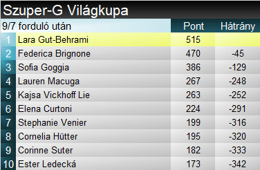 A szakági tabellán sűrűsödött a helyzet. Gut-Behrami tartja vezető helyét, ám előnye már csak 45 pont Brignonéval szemben. Egy még impresszívebb versennyel Goggia is esélyes pozícióba hozhatja magát, másvalaki ugyanakkor már nem szólhat bele a kristálygömb sorsába. Összetettben már csak matematikai esélyről beszélhetünk Gut-Behrami esetében. Szélsőséges esetben akár már holnap, hazai lejtőjén megkoronázhatják másodjára Brignonét.
