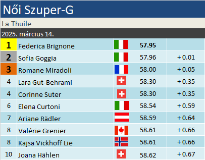 Tegnap még belerondítottak az olaszok örömébe, ma viszont olasz kettős győzelem született La Thuile-ben, épp a hazai Federica Brignone vezetésével. Előnye a lehető legkisebb volt, mindössze egy századdal előzte meg Sofia Goggiát. A verseny szorosságát jól jelzi, hogy a harmadik Romane Miradoli elamradása is mindössze 5 század volt. Gut-Behrami és Suter holtversenyben végzett a negyedik helyen. Ezzel egyrészt Gut elvesztette a vezetést a szakágiban, de Brignonével lényegében egálban érkeznek a VK-döntőre. Az olasz pedig immár szinte biztos, hogy az összetettet is újból megnyeri 5 év után.