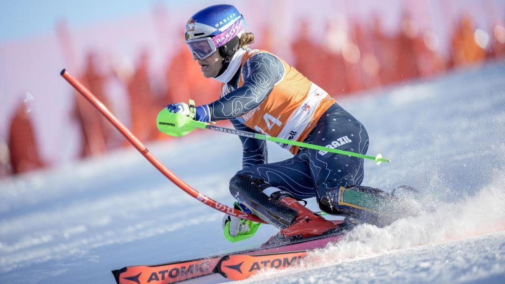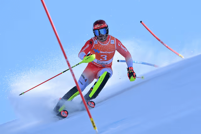Már csak az első futam legjobb három sízője volt hátra, akik közül az éllovas Meillard leszámítva a másik két sízőnek nem volt jelentős előnye. Fabio Gstrein (6.) ugyan gyorsan el is adta előnyét, a meredek után viszont jelentős zárkózásba kezdett. A záró szektorban azonban ismét kissé megbicsaklott a lendült, így a norvég dominanciát ő sem tudta megtörni. Három hazai ellen érkezett még egy „feledik”, Lucas Pinheiro Braathen (3.). A meredeken nagyon bátran síelt, és onnan leérve is jól mentette tovább lendületét. Az utolsó nehezebb vertikálison azonban megbicsaklott egy pillanatra, ott ment el a vezetést. Loïc Meillard (1.) már fél másodperces előnyből indult, amit fent még növelni is tudott. Az első letörésen azonban előre billent, így nyitott volt a verseny. Lendületet nem vesztett, és még egy második megbillenést is át tudott vészelni, megverte a hazai szlalomhadat a győzelemért!