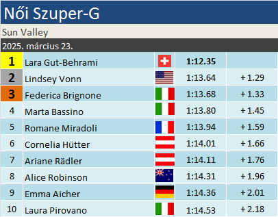 Annál jobban nem mutatja meg egy sportember nagyságát, hogy akkor képes előhúzni rejtett erőtartalékait, amikor a leginkább szükség mutatkozik rá. Márpedig Lara Gut-Behrami ma úgy leiskolázta a női mezőnyt, hogy időeredményével a férfiak közt is a 9. helyen végzett volna. Tette mindezt úgy, hogy ezen a télen Fede’ esetében tényleg kolbászból van a kerítés. Lara 47. Világkupa-győzelmét aratta a mai napon, amivel maga mögött hagyta az örökranglistán Renate Götschlt, illetőleg Marc Girardellit. Ami kifejezetten a Szuper-G-t illeti, 24 sikernél tart, vagyis még 4 választja el Lindsey Vonn rekordjától. Ha már Vonn, a 40 esztendős (másik) élő legenda 138. alkalommal állhatott dobogóra a Világkupában, először az ötéves kihagyást és 2565 napot követően. A negyvenes amerikai és a 33 éves, 99 pódiumnál tartó Lara mellett a 34 éves Brignone ünnepelt még dobogón, mégpedig 84. alkalommal.