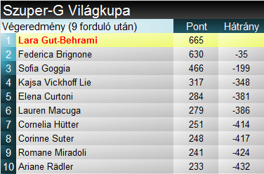 A mai napig Lindsey Vonn-nal és Katja Seizingerrel holtversenyben trónolt a csúcsok csúcsán, mától kezdve már Lara Gut-Behrami minden idők eredményesebb szuperóriás-műlesiklója. Legalábbis a kristálygömbök számát tekintve. Egyazon szakágban (legalább) hat trófeát egyébiránt keveseknek sikerült összegyűjteni: Lara ezzel Shiffrin (SL, 8), Vonn (DH, 8), Moser-Pröll (DH, 7), Stenmark (GS, 7), Hirscher (SL, 6; GS, 6) és Schneider (SL, 6) alkotta csoporthoz csatlakozott.