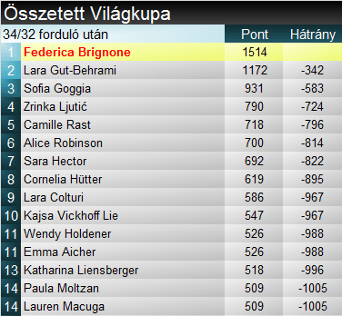 Federica Brignone (3.) zöldülő szektorral nyitott, tehát becsülettel felvette a kesztyűt. Ám a kulcsszakaszon egyszerűen nem tudott lépést tartani fő riválisával. A vagányság megvolt, ívei komoly zökkenőkkel valósultak meg. Miradolit bő 2 tizeddel ellökte a második helyről, de mindez lényegtelen volt. Eldőlt, hogy Gut-Behrami a szezonbajnok! Sofia Goggia (19.) a középső szakaszon komoly késésbe keveredett, nyilván keményen vágta léceit ívre, mint szokása. Egyetlen jobbosban elbukott 2 másodpercet, miután szinte állóra kellett fékeznie a kanyarvételért.