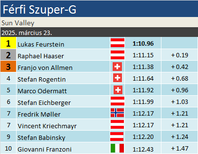 Az osztrákok esetében igaz, hogy idén mindig a legreménytelenebb helyzetben hozták vissza magukat a buliba. A Feurstein-unokatestvérek, Kriechmayr, illetve Haaser volt az egész szezon utolsó pillanatos hőse. Utóbbi kettő tette mindezt sérülések közepette. Lukas Feurstein a decemberben, Beaver Creekben szerzett első dobogója után szerezte meg karrierje első sikerét, szintén szuper-G-ben. Az osztrákokkal kis híján megesett az a szégyen, ami utoljára 1987-ben, azaz, hogy férfi sízőik egyszer sem állhattak a dobogó tetejére. Ettől a blamától mentette meg ma a sógorokat Feurstein és Haaser. Raphael Haaser, csakúgy mint tavaly, idén is két szuper-G-n állhatott dobogóra, összesen pedig 5-nél tart, mindegyik ebben a szakágban. Ahogy Feurstein, úgy ő is az osztrákok becsületét mentette idén – szezonközi sérülés után előbb Kitzbühelben állt dobogóra, majd óriásban lett meglepetésre világbajnok. Most a múlt heti, fogtörős bukást követően végzett ismét a legjobb háromban. Franjo von Allmen kerrierje 8. dobogóját szerezte, a harmadikat szuper-G-ben. Idén közel sem volt olyan eredményes a technikásabb szakágában, de ezzel együtt is egy győzelem, egy harmadik hely a mérlege.