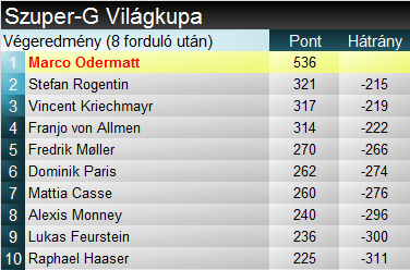 Összetettben Odermatt már Hafjellben bajnok lett, a csata inkább a dobogóért volt még nyitott. Azzal, hogy a lesiklást törölték, már valószínű volt, hogy von Allmen végül nem zárkózik vissza a harmadik helyre. Ez még mai dobogójával, és Meillard nullázásával sem sikerült. Így inkább azt kell figyelni, vajon a technikai számokban jelenleg bombaformában lévő Meillard tud-e 75 pontot fordítani Kristoffersennel szemben. Jelenleg ez még közel sem eldöntött, egy kiesés, vagy épp a napi forma is még többször megkavarhatja az állást.