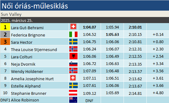 Jókora mentális blokkon kerekedett felül a szezonfinálé helyszínén Lara Gut-Behrami. Minap tett nyilatkozata legalábbis erre enged következtetni. A szuperóriást férfiakat is megszégyenítő futammal húzta be, úgy a versenynapot, mint az egész idényt tekintve, ma pedig óriás-műlesiklásban idézte fel előző idényben tapasztalt kérlelhetetlen síelését. Miközben Brignone – szokás szerint – ismételten agyonverte a mezőnyt, az olimpiai bajnok svédet kivéve. Lara a 48. győzelmét aratta a Világkupában, vagyis még kettő választja el Alberto Tombától, illetve hét minden idők legeredményesebb svájci sízőjétől, Vreni Schneidertől. Jól csengő statisztikai érdekesség továbbá, hogy ma sikerével Lara lett az első nő, akinek legalább 10 győzelme van 3 különböző szakágban. A férfiaknál ezt Pirmin Zurbriggen és Hermann Maier mondhatja el magáról. Dobogók tekintetében ma érkezett mérföldkőhöz, elérte ugyanis a százas határt – tízedikként az alpesi síelés történetében! Girardellit befogta, s még egyre van a svájci csúcstartó Schneidertől. E tekintetben szinte bizonyosan ő lépi túl elsőként a helvét legendát, győzelmek számában erre Odermattnak nagyobb esélye lesz. Brignone összességében a 85., óriásban a 42. pódiumát szerezte, míg Sara Hector 24. alkalommal (óriásban 21.) vett részt ceremónián.