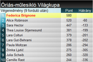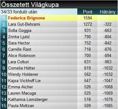 Összetettben konzerválódott a dobogó, minthogy Ljutić nem tudott zárkózni Goggiára, az olasz biztos a harmadik helyen végez a szezon végén, de az 1000 pontos határt nem tudta átlépni.