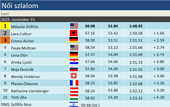 Mindkét futamot megnyerve, toronymagasan húzta be a szezon első szlalomversenyét Mikaela Shiffrin. Az immáron kilencszeres Levi- győztes amerikai mögött a 19. születésnapját a mai napon ünneplő Lara Colturi, valamint az élete első műlesikló dobogóját jegyző Emma Aicher szerepelt még a pódiumceremónián. A 4. helyet Paula Moltzan és Lena Dürr párosa szerezte meg holtversenyben. Hatodikként a szakági címvédő Ljutić zárt. Csaknem 10 év után szerzett újra magyar síző pontot a Világkupában: Tóth Zita 60-as rajtszámmal kvalifikált a második futamba, melynek végén a hat pontot érő 25. helyen végzett. Technikai számban most először történt ilyesmi a női mezőnyben. Nagyon közel állt a pontszerzéshez Szőllős Noa, ám hiába repesztett egy második legjobb szektort, végül háromtizeddel kiszorult a TOP30-ból.