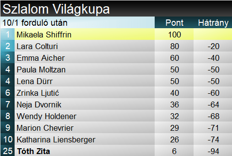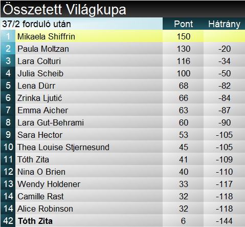 Tóth Zita (60-assal a 27.) a felkészülés során élesített posztjaiban arról számolt be, hogy remekül sikerült mind az alapozás, mind a léctesztelés, a havas edzésekről nem is szólva. Ott volt nemzetközi csapata részeként a lappföldi edzőtáborban, ahonnan szintén jó hírek érkeztek. A lejtő remek állapotát is figyelembe véve bizakodhattunk. Eredményesen. A Vasas sportolója nagyobb megingás nélkül, remek ritmusban teljesítette a pályát. Csak egyetlen szektorban, odafent szorult harmincon túlra, de a kiesők és a gyengén meredeksíző riválisok miatt az is valójában TOP30-cal kecsegtetett. Ami végül megvalósult, 2.84-es hátránnyal (a dobogótól 1.35-re, a TOP15-től 48 századra) ért célt. Ekkor voltak még több mint húszan, a továbbjutást mégis szinte biztosra vehettük. Magyar alpesi síző korábban még sosem síelt második futamot a Világkupában!