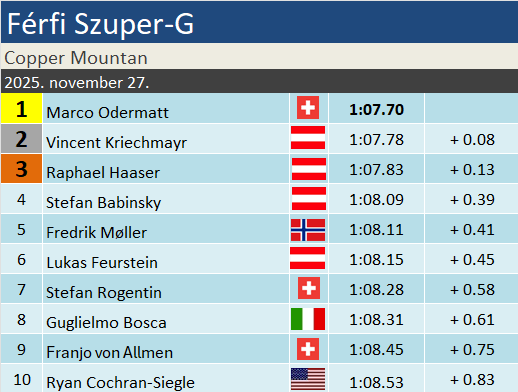 Marco Odermatt masszív osztrák csörtét vert vissza elsősorban stabil sízésének köszönhetően, a Copper Mountainben rendezett idei első szuper-G-n. A legjobb hatban ugyanis négy osztrák végzett, a győztes mögött mindjárt három. Vincent Kriechmayr győzelme mindössze 8 századon múlt, míg mögötte Raphael Haaser és Stephan Babinsky követte. Fredrik Møller egy nagy hibával dobta el talán a győzelmet, de a dobogót mindenképp, így viszont „csak” az ötödik helyet szerezte meg, megelőzve Feurstint. Két év után ismét versenyezni láthattuk Aleksander Aamodt Kildét, aki a hosszú kihagyás ellenére is pontszerzéssel tért vissza.