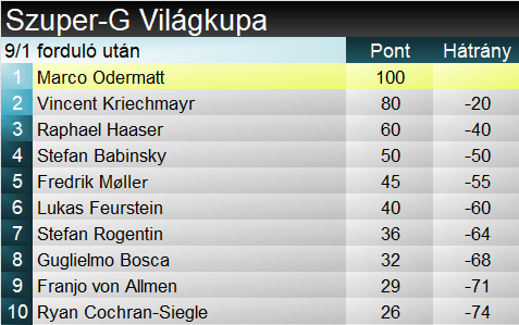 Marco Odermatt (1.) remekül kezdett, középen viszont kissé visszafogottabbnak tűnt. A szakág háromszoros címvédője azonban a végén begyújtotta a rakétákat és fordítani tudott az eddig alul verhetetlennek tűnő Kriechmayrrel szemben. Fredrik Møller (5.) a cél előtti laposabb részt bánhatja igazán, teljes hátrányát ott szedte össze, így az sem volt elég számára a dobogóhoz, hogy a végén pár századdal még Odermattot is verte. Az, hogy a sízők egyre inkább érzik a pálya végét, további igazolást kapott: Raphael Haaser (3.) a kezdeti hátrány után a laposabb részen jócskán rávert Odermattra, majd a végén tartotta kisebb hátrányát, ezzel megkaparintva a dobogó pillanatnyi legalsó fokát.