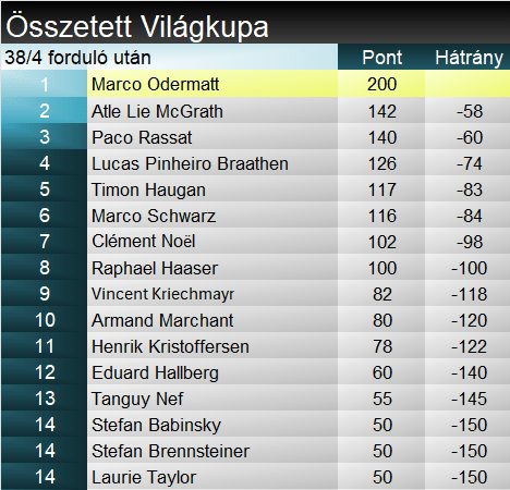 A szakági világkupában természetesen egy versenyt követően Odermatt vezet, és idei második győzelmével visszavette a vezetést az összetettben is, ahol eddig a gurgli győztes Paco Rassat állt az élen. A francia a harmadik helyre esett vissza, mivel McGrath a második helyre ugrott mai erős pontszerzésével.
