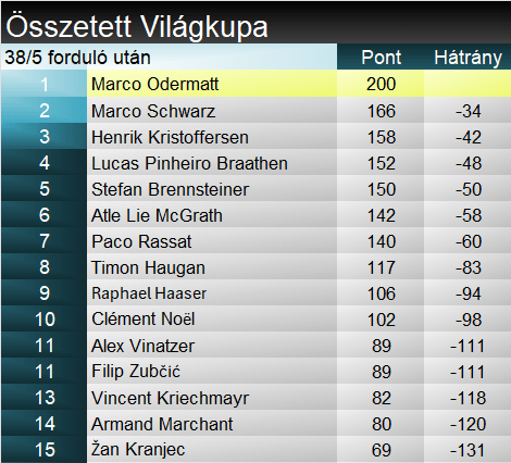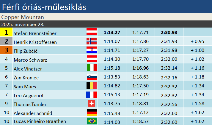 Stefan Brennsteiner októberben töltötte be a 34. életévét. A salzburgi specialistát részint sérülések, részint puszta szerencsétlenség, részint banális hibák (gondoljunk a vb-n lecsatolódott lécre) miatt eddig az igazi sikerek elkerülték. Olimpiai bajnok, de csapatban, a vb-ken pedig egy 9. hely volt a legjobbja 2019-ből. A mai volt mindössze az ötödik dobogója a Világkupában. Mindössze, tekintve milyen kiváló sítudású sportolóról van szó. Ha két versenynap után le szabad ilyesmit írni, akkor bizony jelenleg élete formájának örvend. Henrik Kristoffersen korántsem, ugyanakkor ma, szám szerint 95. dobogója talán kihúzza őt a szezon eleji apátiából. Filip Zubčić csaknem két év után zárt újra a TOP3-ban. Az azóta az elitcsoportból is kizuhant horvát akkor a legendás adelbodeni óriáson zárt harmadikként.