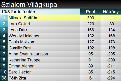 Mikaela Shiffrin 104. alkalommal győzött a Világkupában, ami csak a szlalomot illeti, 67 sikernél és 92 dobogónál tart. Ha egészséges marad, idén sem lehet őt megverni, úton van kilencedik kis kristálygömbje felé műlesiklásban. Lena Dürr a 18. dobogóját szerezte meg, ebből egy 2013-as paralleles sikerén kívül valamennyi szlalomban született. Jellemző a Shiffrin/ Vlhová által uralt évtizedre, hogy ezekből csak egyszer állt a pódium tetejére. Lara Colturi épp csak túl a 18. születésnapján a rutinos német termésének a harmadánál tart. Sokatmondó ugyanakkor, hogy ennek felét ebben a szezonban gyűjtötte, pedig a december még csak most kezdődik…