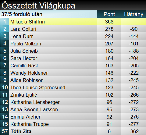 Újabb kegyetlen erődemonstráció a szlalom, meg úgy általában az alpesi sízés királynőjétől. Mikaela Shiffrin fölényes diadallal felfedtette tegnapi csalódást keltő szereplését. Az első futam során még nem pörgött teljes hullámhosszon, másodjára újfent igazolta verhetetlenségét. Több mint másfél másodperccel előzte meg az egyébként délután szintén remekül síelő Lena Dürrt. A 2 szekundumon belüli időhatárt még ketten oldották meg, közülük Lara Colturi állhatott fel dobogóra, idén már harmadszorra – letaszítva onnan a másodjára nagyon gyöngén szereplő Holdenert. Swenn-Larsson, Liensberger, Truppe, Moltzan, Hector és Rast fért még a TOP10-ba, míg a legjobb második futamot a franciák részéről Caitlin McFarlane síelte, aki ezzel 16 pozíciót javítva a 12. helyen végzett.