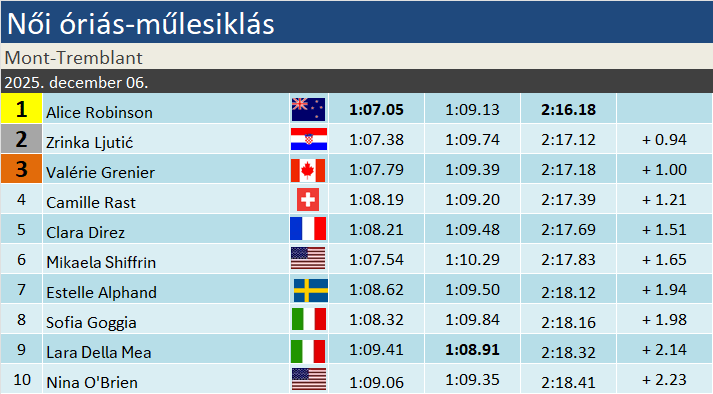 Alice Robinson hatodik győzelmét és 19. dobogós helyezését szerezte a Világkupában. Eleddig kizárólag óriás-műlesiklásban volt eredményes, de idő kérdése, és a gyors számokban is utat törhet magának. Zrinka Ljutić idén először szerepelt a pódiumceremónián, elsődleges számában, szlalomban – címvédőként – kifejezetten bizonytalannak mutatkozott. Másodjára állt dobogóra óriásban, újra annak második fokára. Valérie Grenier ötödik TOP3-helyezését gyűjtötte be, a negyediket óriásban. Legutóbb 1 éve Cortinán állt dobogóra, két napra rá jött súlyos sérülése.