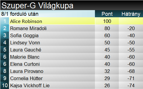Alice Robinson a hetedik győzelmét aratta a Világkupában, hat óriás-műlesiklást követően először győzött másik szakágban. Ez a hatodik szezon, amelyben kacérkodik a szuperóriással, eredményei javulófélben voltak. Két éve hetedikként, idén a 11. helyen zárt a világbajnokságon a kanyargósabb gyors számban. Jelenleg még kétséges, hosszabb távon tartósítja-e mai formáját, az esetleges összetett esélyekhez SG-ben dominancia, lesiklásban pedig többszöri vaskos pontszerzés kellene – meggyőző óriás-műlesiklás mellett. Romane Miradoli ötödik dobogós helyét ünnepelte, a 2022-es lenzerheidei versenyen aratott győzelme óta nem volt ilyen magasságokban a francia. Sofia Goggia 20. alkalommal szerepelt pódiumceremónián Szuper-G-ben.