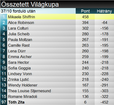 Ha nem kóválygott volna le méretes késésekkel a záró kanyarokban Camille Cerutti (17.), folytathatta volna a kiváló francia szereplést. A meredekhez érve topszektort hozott, az ugratóhoz öttizedes időkülönbséggel érkezett. Azok a lányok jártak jól, akik a sebesség oltárán feláldozták a szép nyomvonalat. Így tett Jasmina Suter (12.), önmagához képest jó helyezés lett jutalma. Valérie Grenier (29.) ízlésének túlzottan vehemens volt a pálya, sokat bizonytalankodott, akárcsak az osztrákok örökös EK- menője, Nadine Fest (26.). A laposon nem jött jól a sok fékezgetés. Érdemes volt még kivárni, mit nyújt a hétvége meglepetésembere. Magdalena Egger (15.) alapvetően nem ment rosszul, csakhogy az ugratót megelőző lankásabb részen kitért a tojástartásból, ugrását pedig elkalimpálta. Bágyatag lesiklásai után egész korrekt menetet rakott össze Elvedina Muzaferija (24.), Asja Zenere még inkább ismerkedik a szuperóriással. A záróugratót túltolta, kevésen volt, hogy nem tarolta le a soron következő kaput. Karen Clément (36.) zárta az első harmincast. Senkit nem előzött meg, főként a traverznél tapasztalt komoly mélyre kerülése miatt.