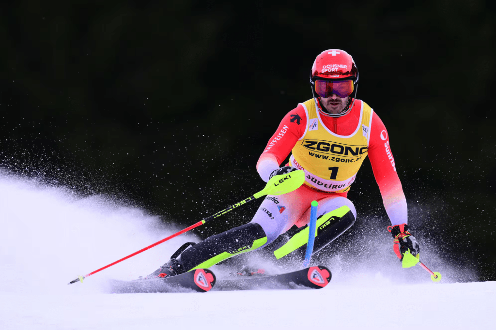 Loïc Meillard (3.) nyitotta a menetek sorát. Jófajta tempót diktált, még a lankára is megfelelő lendületet tudott átvinni. Fent egy pillanatra megcsúszott a külső léce, egyéb nehézsége nem akadt. Timon Haugan (5.) felül valamivel tisztábban haladt át. A meredekben egy hullámnál rövid időre elemelkedett az előző verseny győztese, de gyorsan visszatalált a ritmusba. A céllejtőn kissé távolabb maradt a kapuktól, és 25 századdal maradt el. Fabio Gstrein (4.) a felső szakaszon hátraesett a súlypontja, de magával vitte a lendületet, nem kellett keresztbe állítania a síléceket. A céllejtő bejáratánál kissé keresztbe tette a léceket, enyhe késés lett belőle. Egyetlen tizeddel szorult a második helyre. Clément Noël (1.) felül egyértelmű előnyben volt. Az első átmenetnél kissé szélesebb vonalat választott, mint a svájci éllovas. A további szakaszokon nagy tempót vitt, 26 századdal lejjebb szorította az alapidőt.