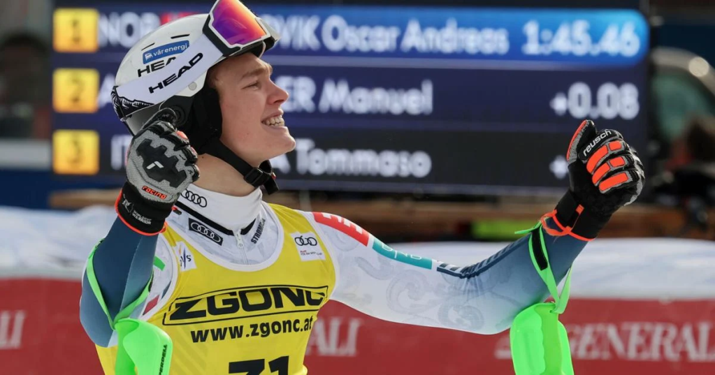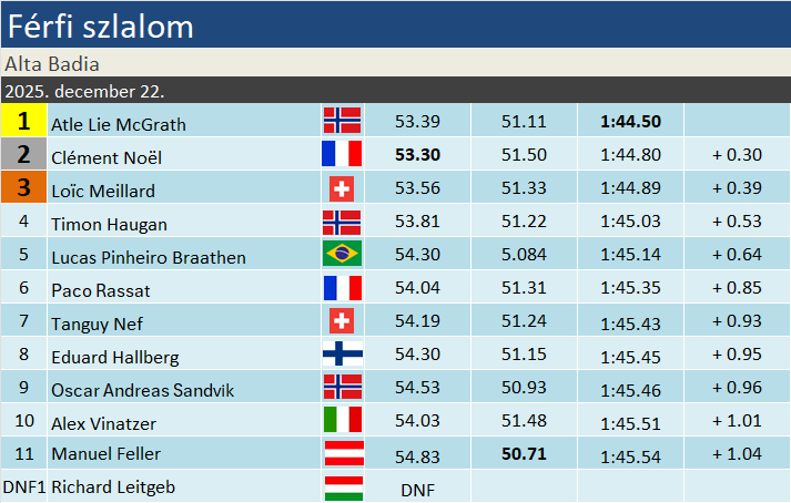 Taktikus, a kulcsfontosságú kimenetre és hullámokra építő menettel nyert meg negyedik VK- versenyét az ifjú norvég, 3 tizeddel maga mögé utasítva Clément Noëlt. A világbajnok Meillard ünnepelhet még dobogón Alta Badián, míg Timon Haugan újabb erős szerepléssel, egy negyedik hellyel stabilizálta vezető helyét a szakági pontversenyben. Braathen az ötödik, Rassat a hatodik. A legjobb délutáni futammal idén először megmutatta magát Feller, ezzel ő lett a legjobb osztrák. Igaz, csak a 11. helyen. Richard Leitgeb kiesett az első futamban.
