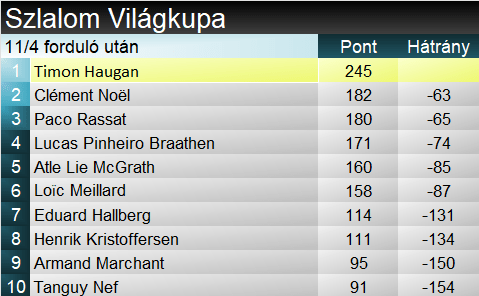 Atle Lie McGrath negyedik alkalommal győzedelmeskedett a Világkupában, mindannyiszor szlalomban. Legutóbb még januárban, Wengenben állt fel a dobogó tetejére. Clément Noël kereken 30., míg Loïc Meillard 32. pódiumát szerezte. A szakágiban Timon Haugan őrzi tisztes, hatvan pontot meghaladó előnyét a franciákkal szemben. Négy verseny után elmondható, hogy mindig a legjobb öt között zárt.