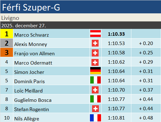 Alexis Monney 6. dobogója a mai, 3-3 lesikló és szuperóriás-műlesikló top3 szerepel immár a neve mellett. A amit leszámítva minden dobogója a tavalyi szezonban született. Franjo von Allmen valamivel eredményesebb honfitársánál, 11. dobogóját ünnepelte. A szuper-G valamivel gyengébb száma eredményességet tekintve, a mai a 4. ilyen előkelő helyezése.