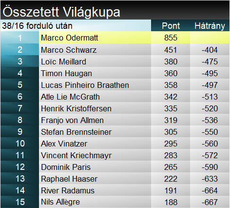 A szakági pontversenyben az első versenyt nyerő, Grödenben második Odermatt továbbra is nagyobb előnnyel vezet, elsősorban a fő rivális Kriechmayr mai nullázásának köszönhetően. A kétszeres idei dobogós Haaser, és a legutóbbi két győztes, Schwarz és Zabystřan hátránya már 100 pont fölötti. Összetettben méginkább egyértelmű a helyzet: Odermatt idén is a tabella élén várja majd az új évet, az 1000 pont pedig a hektikusabb évkezdés ellenére is karnyújtásnyira van már. A dobogós küzdelemben most épp Schwarz áll jobban Meillard-ral szemben.