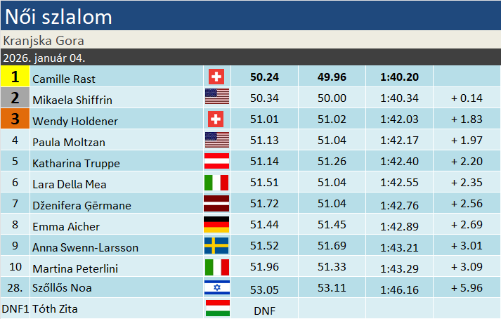 Gigászok küzdelmeként lehet azt leírni, amit a Kranjska Gora-i szlalomon láttunk. Délelőtt nagyjából fél, délután egy teljes másodperccel ment jobban Camille Rast és Mikaela Shiffrin párosa az üldözőknél. A svájciak világbajnoknőjének pedig sikerült az, ami korábban leginkább csak Petra Vlhovának: legyőzött egy csúcskategóriás Shiffrint. A dobogó harmadik fokára Wendy Holdener állhatott fel, miután párszázaddal megelőzte Paula Moltzant. A környéken élő Katharina Truppe végzett az ötödik helyen. Az olaszok parádésan szerepeltek, a hatodik Della Mea és a tízedik Martina Peterlini révén ketten végeztek a TOP10-ben. Szintén élete legjobbját síelte Dženifera Ģērmane, a lett lány a 7. helyen zárt. Kiesett a szakági címvédő Ljutić, valamint az idei háromszori dobogós Colturi. Szőllős Noa önmaga és Izrael első Világkupa-pontjait szerezte meg mai 28. helyezésével. Tóth Zita egy biztató szektor után búcsúzott délelőtt.